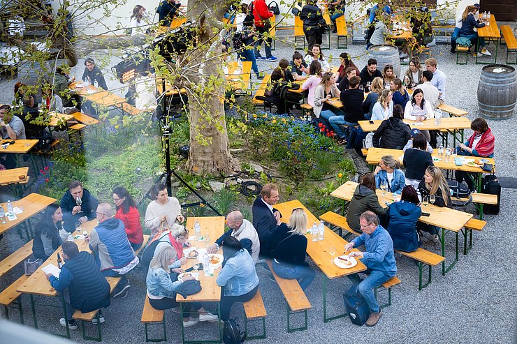 Ein Höhepunkt des Wachauer Weinfrühlings war die Steinfedernight im Schloss Spitz. Hier servierten wir zu den Weinen der Vinea Wachau-Betriebe auch die passenden Beats: Die Weinviertler Band Skolka funktionierte den Hof kurzerhand in eine Tanzfläche um. So geht Stimmung in der Wachau! Stärken konnten sich die Gäste zwischendurch mit süßen und pikanten Schmankerln. Perfekt, um danach die Smaragd-Bar zu erobern.